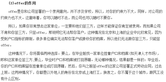 offer,全稱是offer letter,漢語解釋為錄用信、錄取通知。所謂offer letter,還沒一個(gè)統(tǒng)一的名字,有人稱之為“錄取通知”,有人謂之“錄用信”,也有人稱為“要約函”。以前一般是說外企或國外學(xué)校發(fā)的表達(dá)自己愿意錄用的一封格式類似的信件,后來很多人都把自己接到公司的“offer letter”,電話通知等一類的叫offer,被公司通知面試合格能夠錄用就說收到了offer,而真正發(fā)offer letter的也只是很正規(guī)的大企業(yè)。此外,也有人說offer是“錄取通知書加全額獎(jiǎng)學(xué)金”。